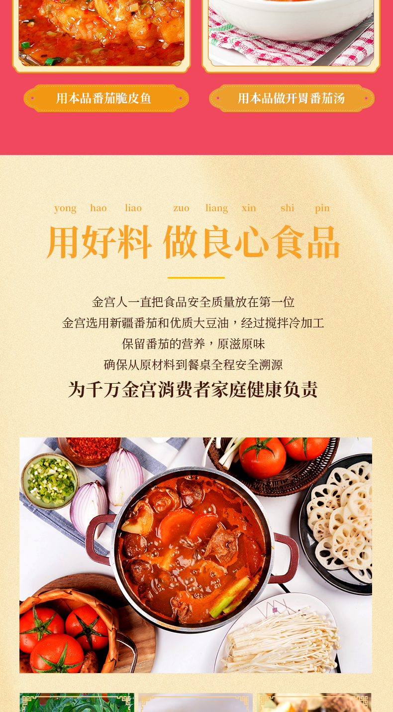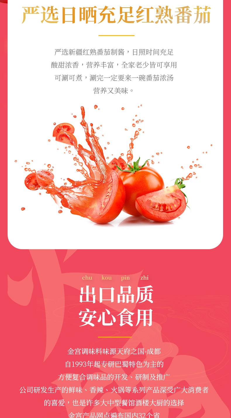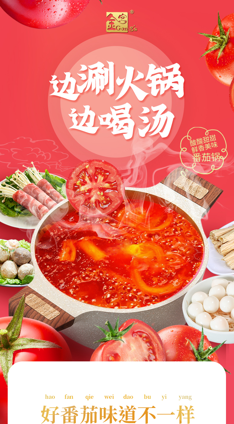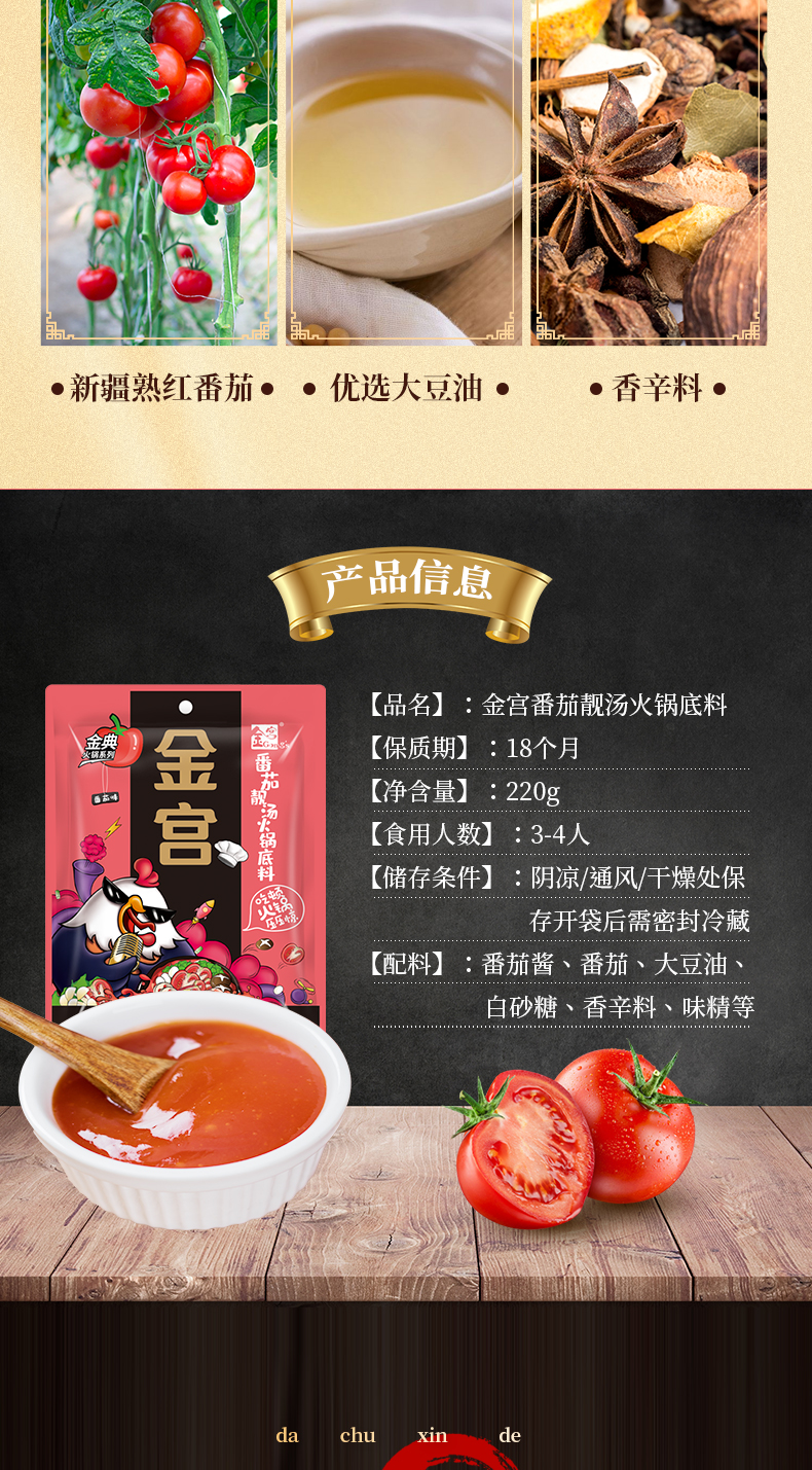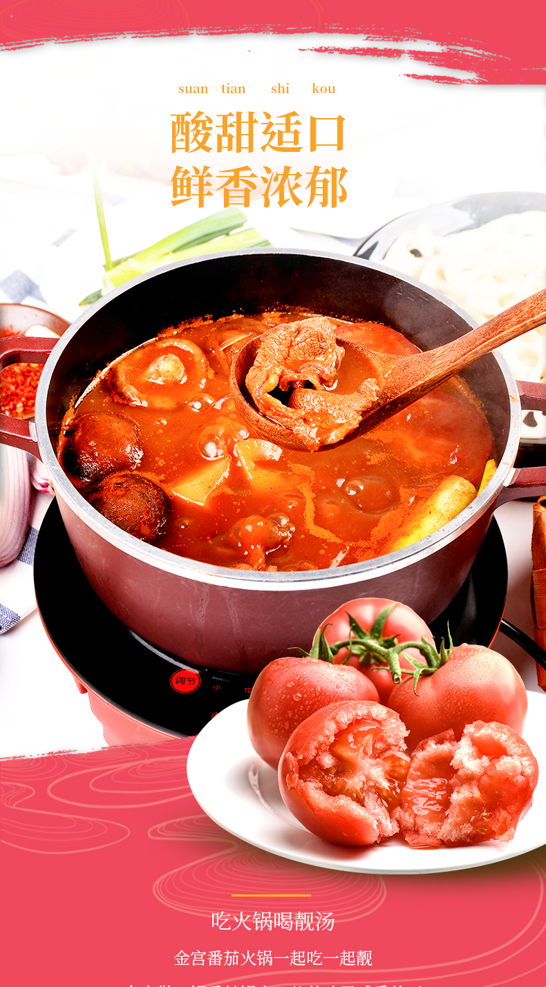 產品簡介:金宮番茄火鍋底料是金宮川派公司研發,精選植物油、番茄、香辛料等精制濃縮而成,顏色紅亮潤澤,酸酸甜甜,番茄香濃,番茄靚湯火鍋底料清新開胃、鮮味適口。
