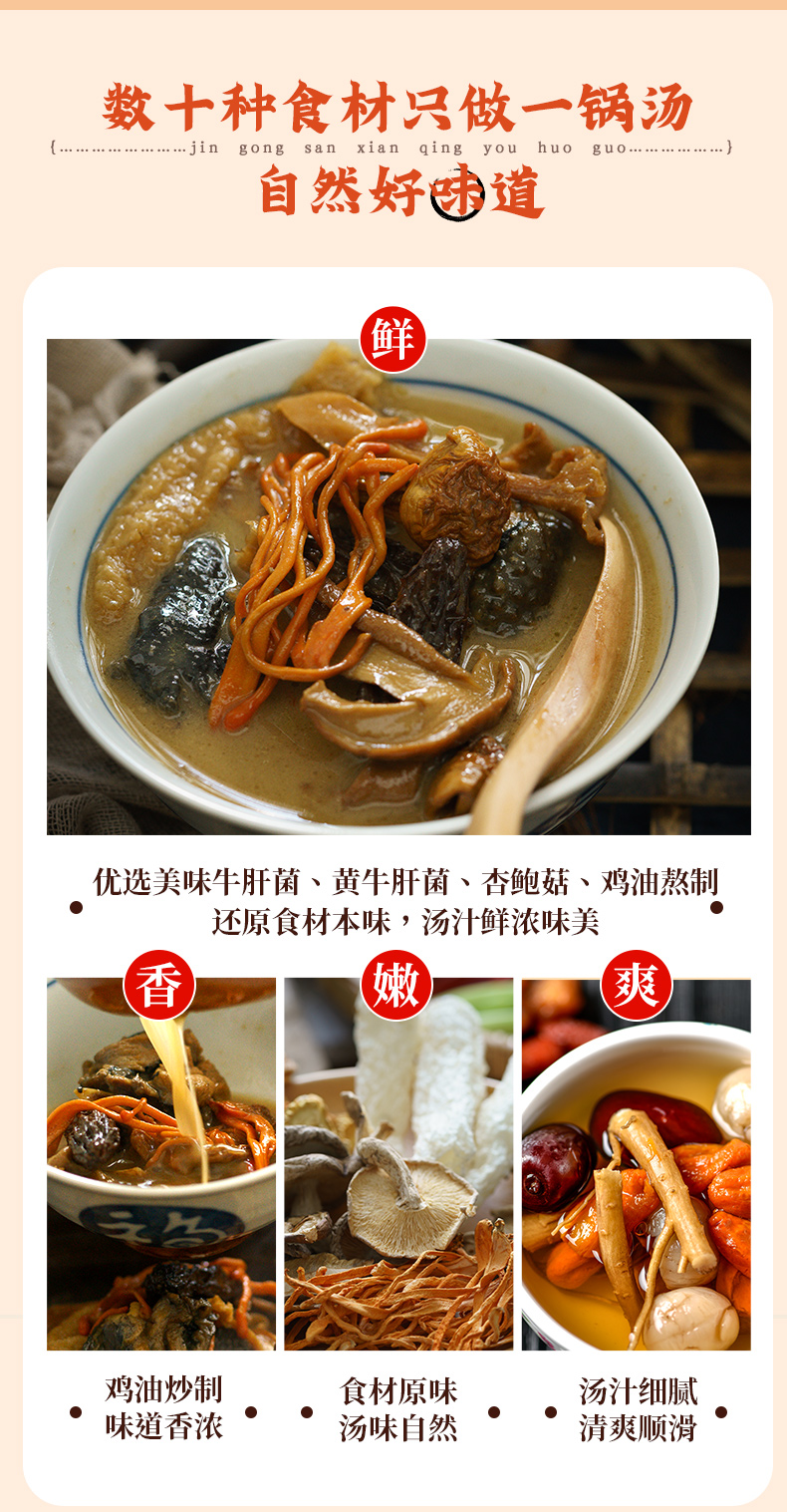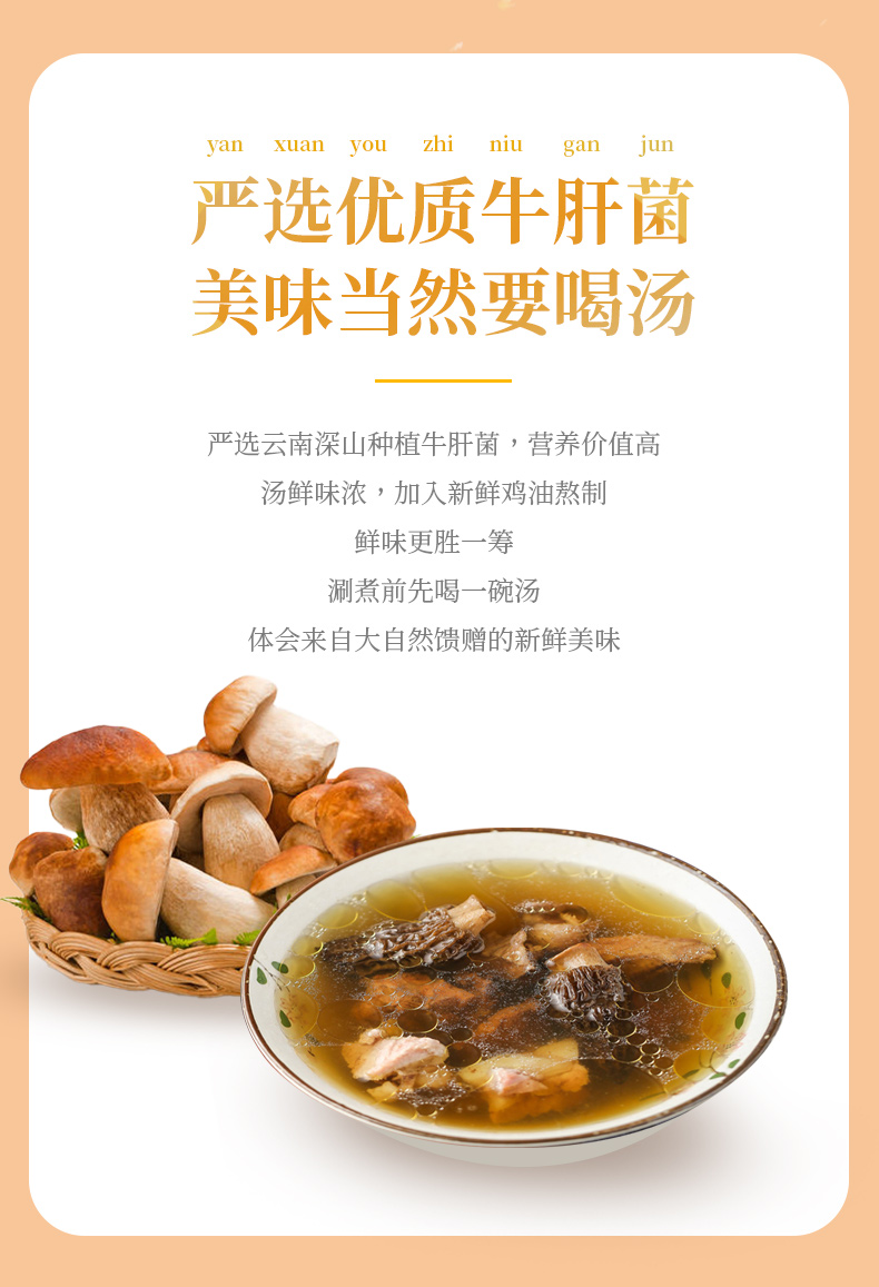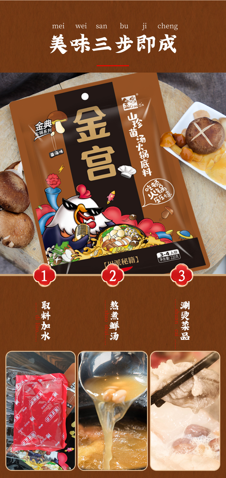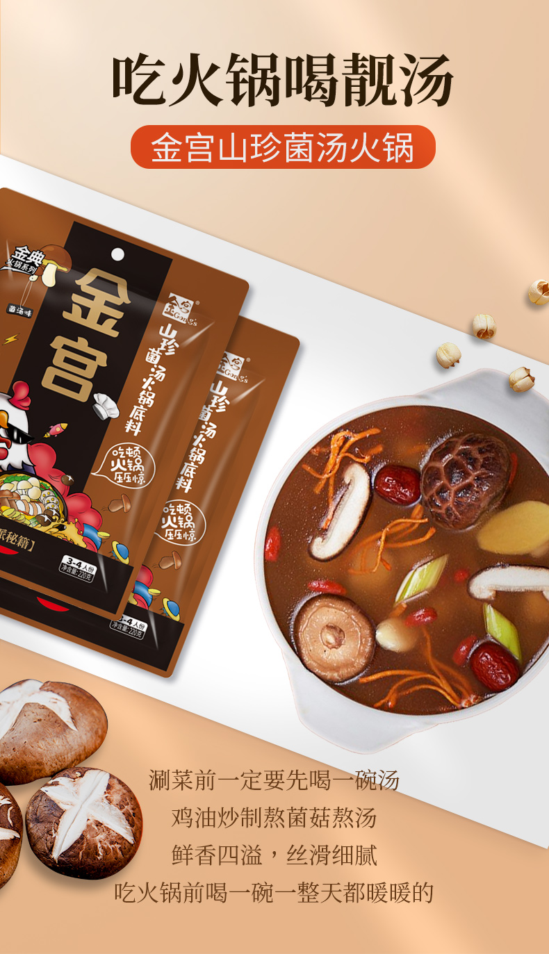 產品簡介:金宮菌湯火鍋底料是金宮川派公司研發,嚴選黃牛肝菌、美味牛肝菌、杏鮑菇、香辛料等多種食材精制濃縮而成。觀其湯色黃亮中泛著油花,聞其香味菌香濃郁撲鼻,嘗其滋味鮮美可口,菌香濃郁、鮮美可口。