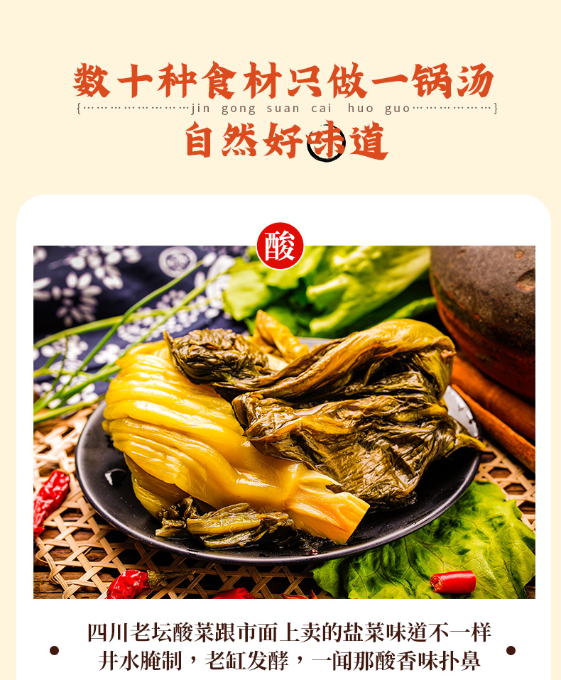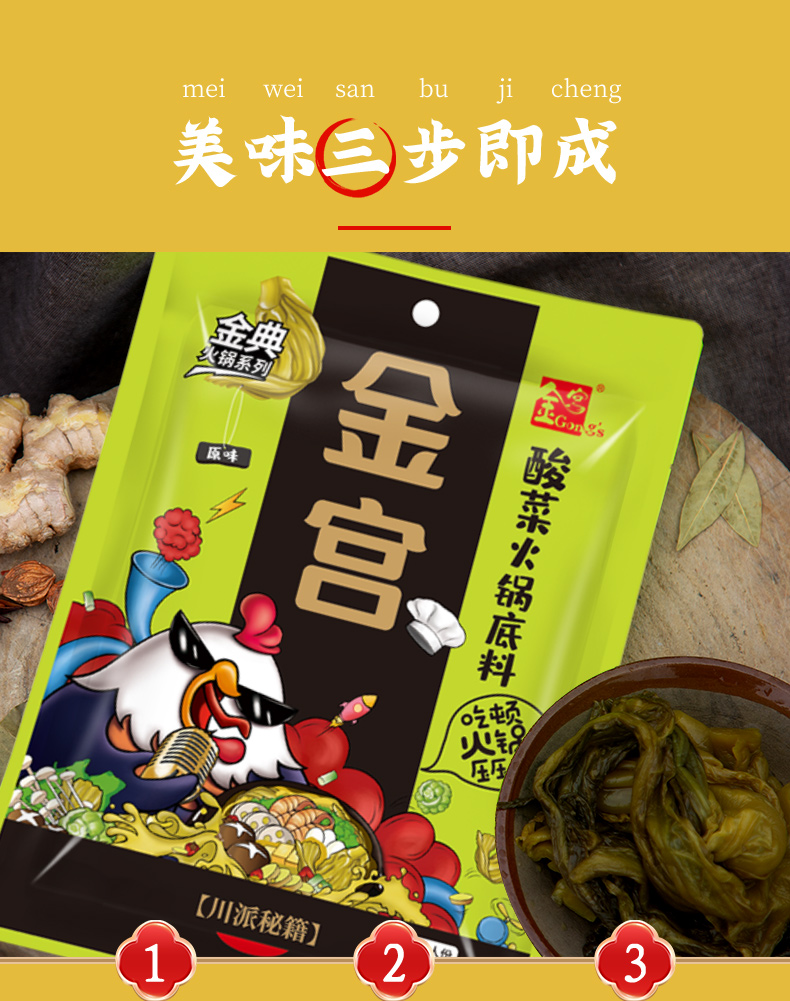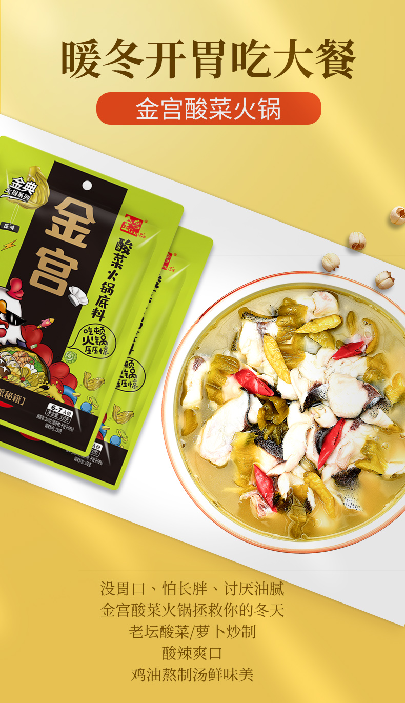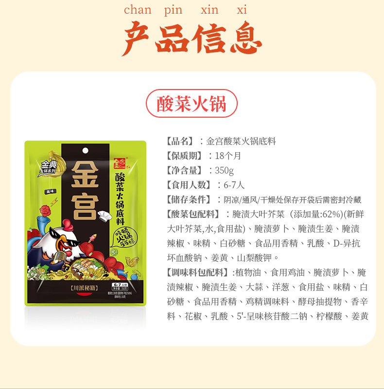 產品簡介:金宮酸菜火鍋底料是金宮川派公司研發,嚴選四川本地腌漬青菜、腌漬姜、腌漬蘿卜等多種食材精制濃縮而成。觀其色湯白濃醇,酸菜青綠;聞其香酸香沁脾、誘人食欲;嘗其味酸香爽脆、湯濃醇鮮。