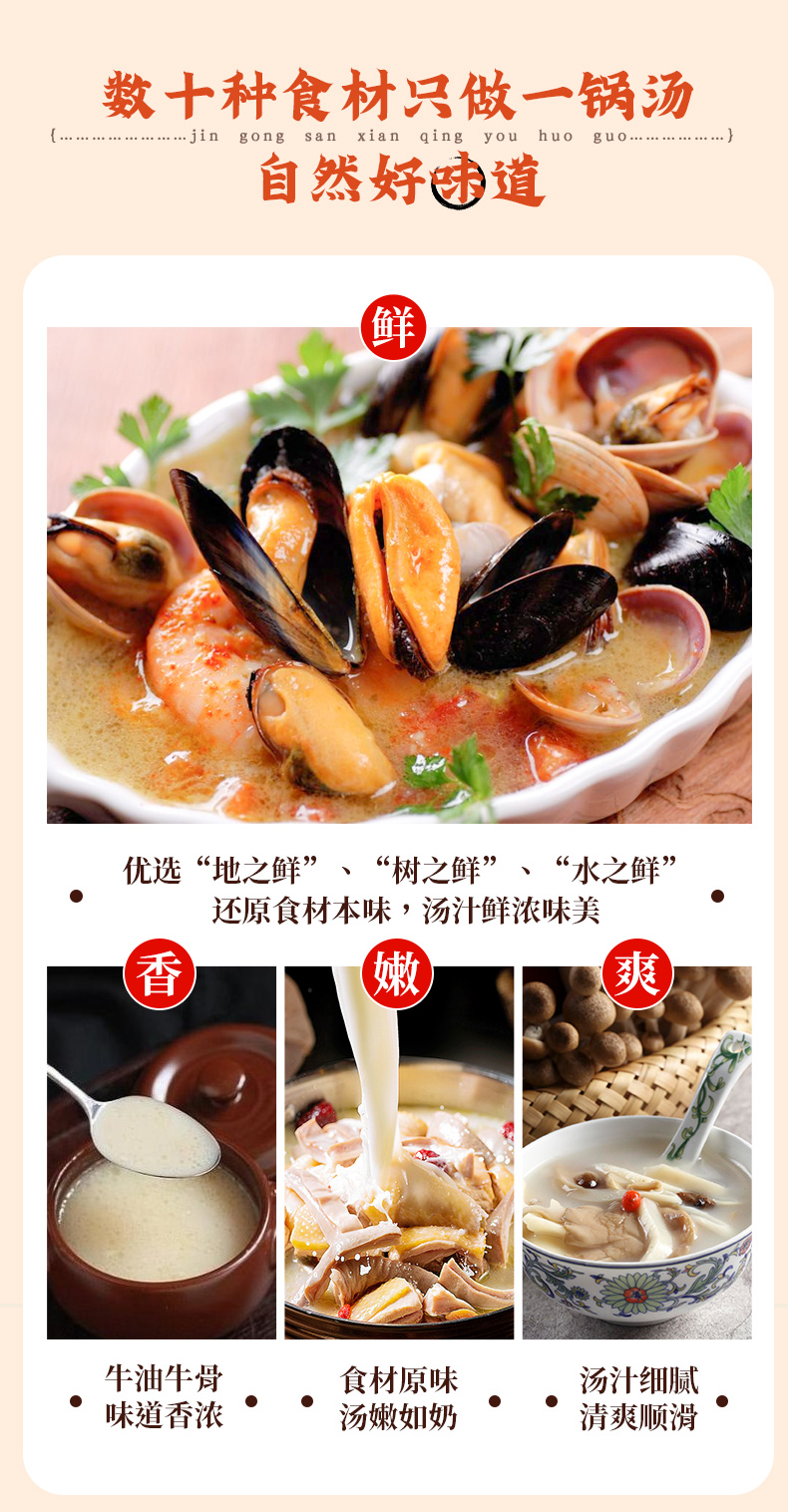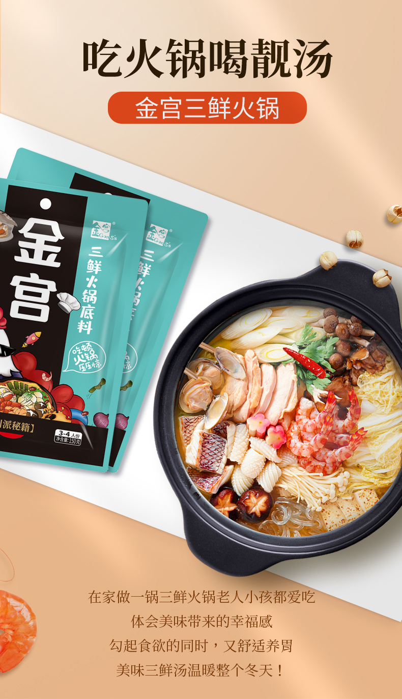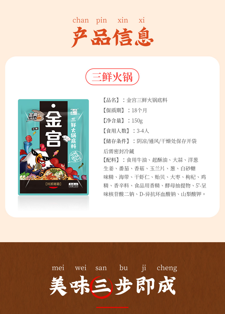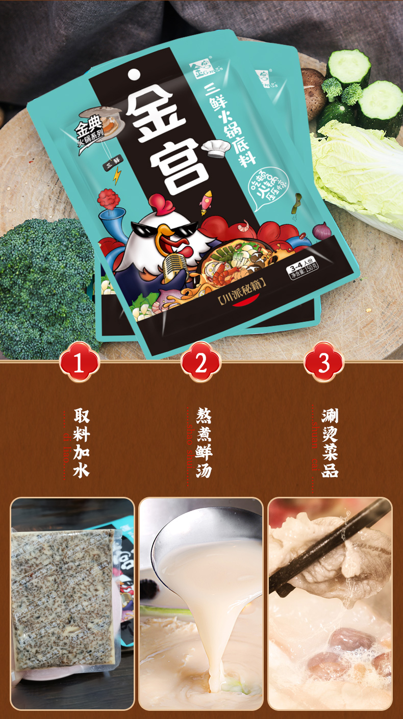 產(chǎn)品簡介:金宮三鮮火鍋底料是金宮川派公司研發(fā),挑選"地之鮮”、“樹之鮮”、"水之鮮"等原材料炒制提煉,湯鮮味美,味濃而不失清爽,鮮香而不掩菜品本味,體現(xiàn)了川派菜品鮮香味濃、清爽夠味的特點(diǎn)。