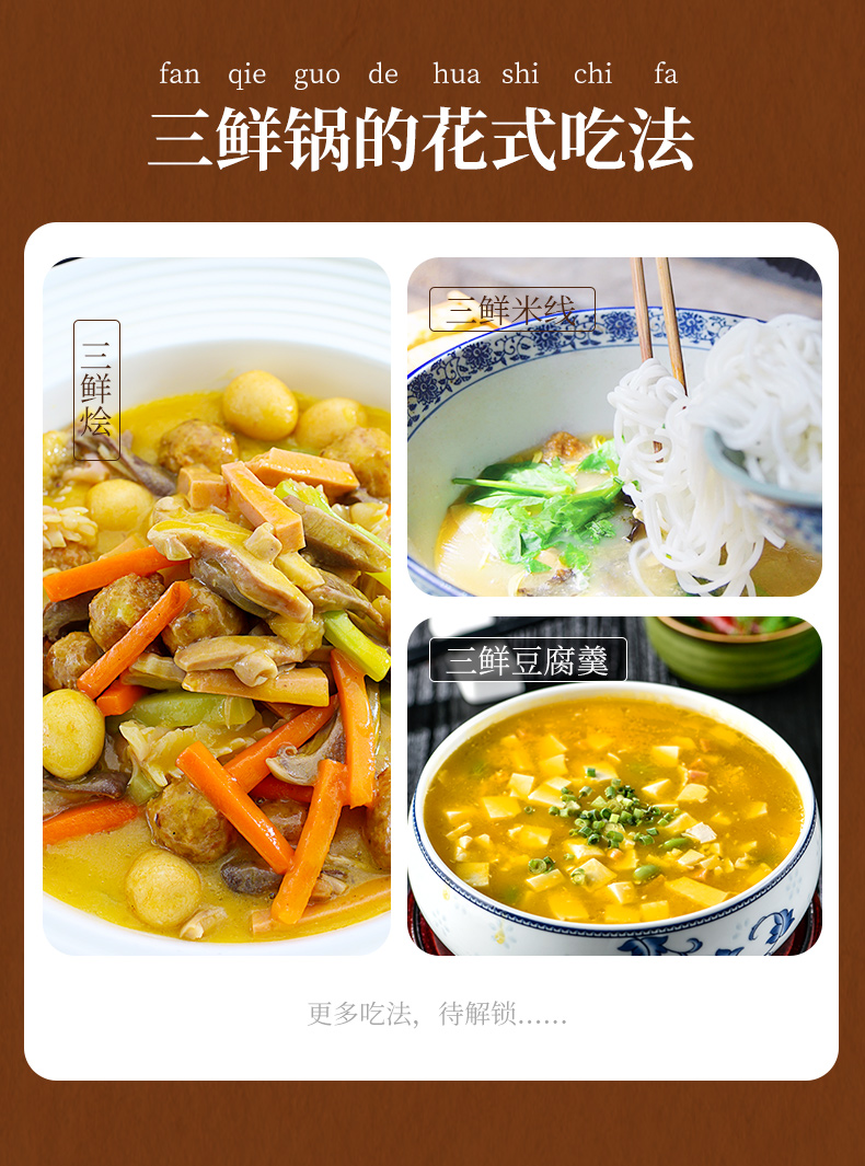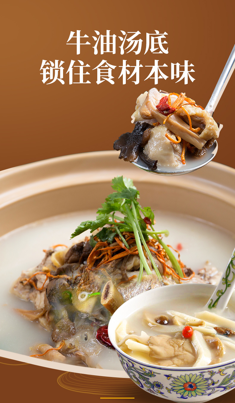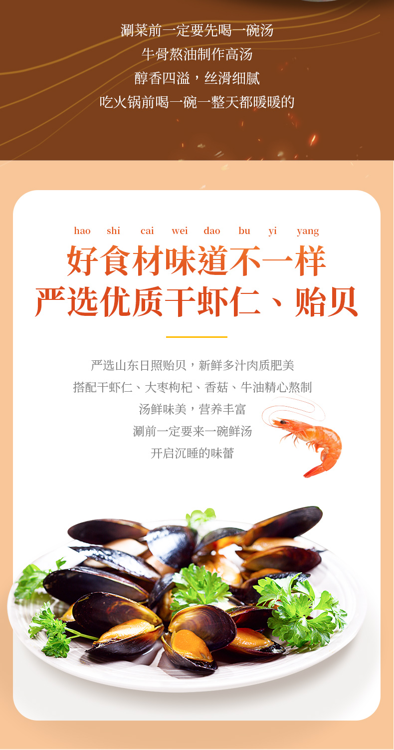 產(chǎn)品簡介:金宮三鮮火鍋底料是金宮川派公司研發(fā),挑選"地之鮮”、“樹之鮮”、"水之鮮"等原材料炒制提煉,湯鮮味美,味濃而不失清爽,鮮香而不掩菜品本味,體現(xiàn)了川派菜品鮮香味濃、清爽夠味的特點(diǎn)。