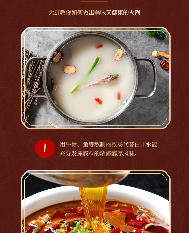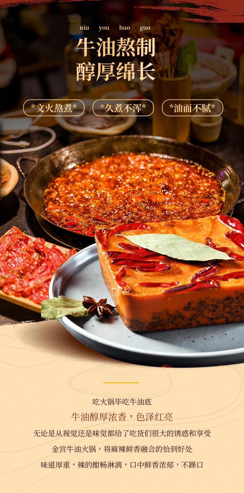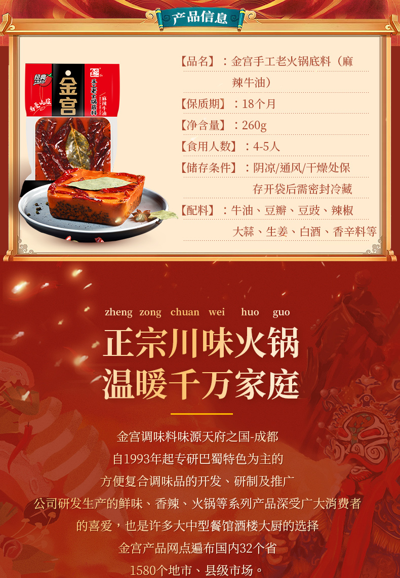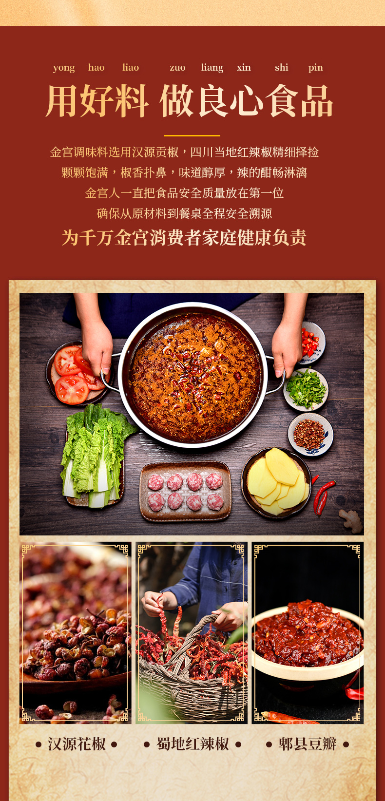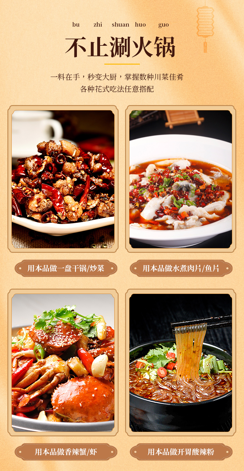 產品簡介:本品經川派火鍋特級配料師匠心打造,精選優質天然香料,秉承傳統工藝,締選麻辣鮮香火鍋經典,帶您品味正宗川派滋味。