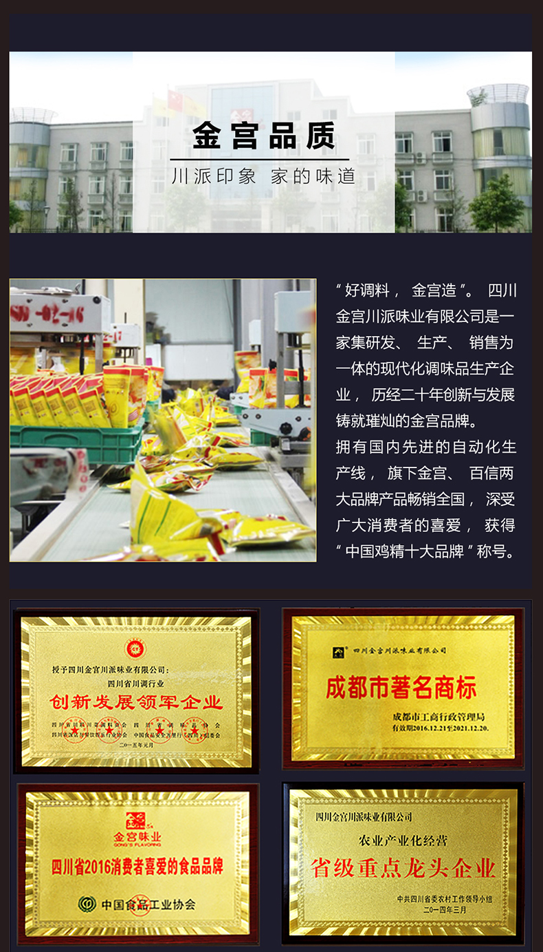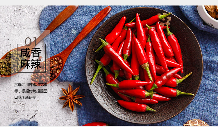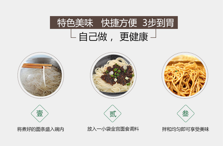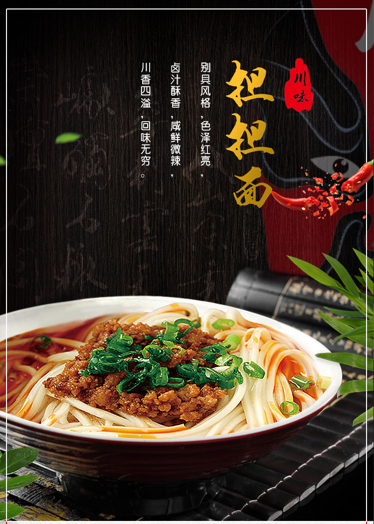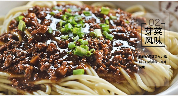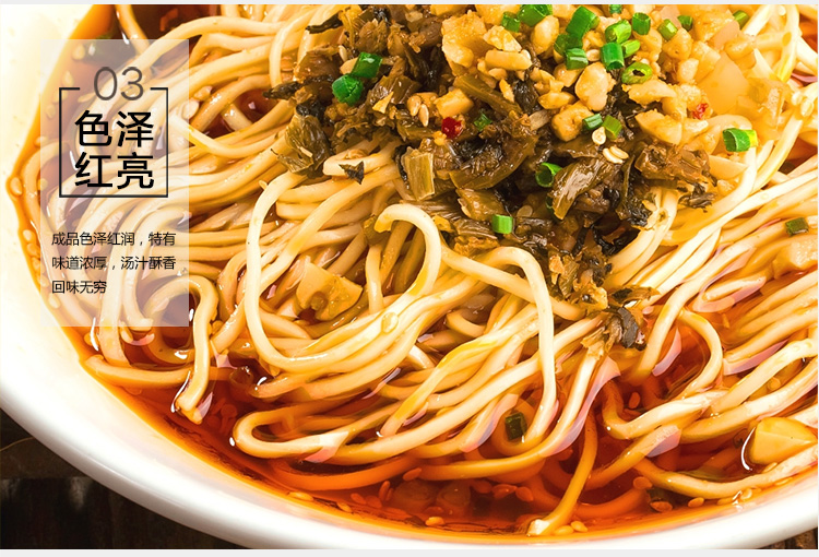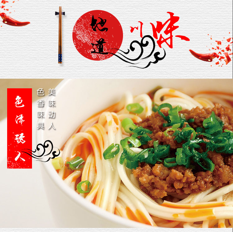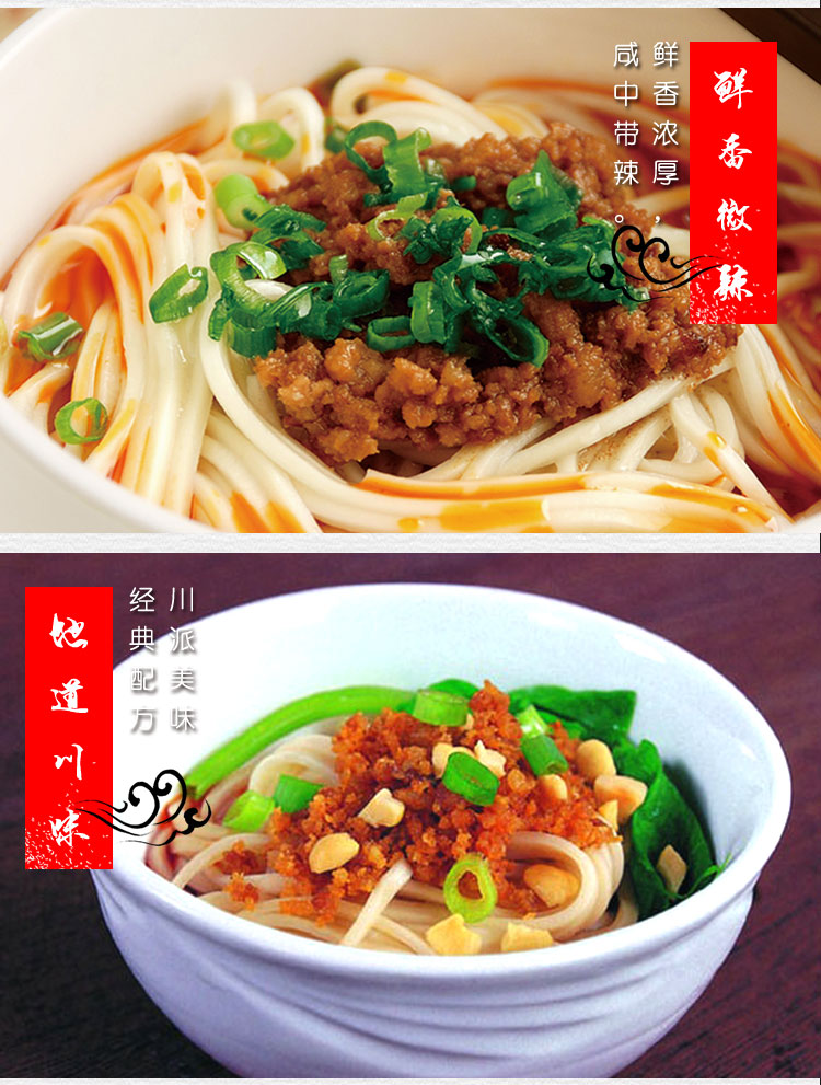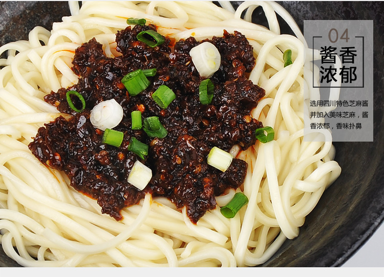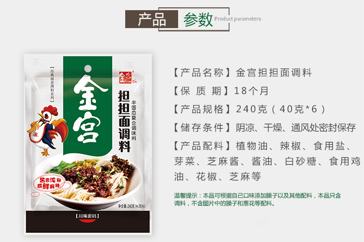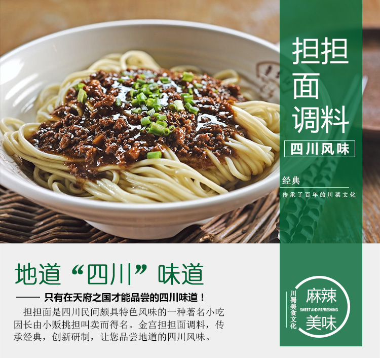 產品簡介:四川名菜—擔擔面,是四川民間頗具特色風味的一種著名小吃,因常由小販挑擔叫賣,而由此得名。金宮擔擔面調料,傳承經典,創新研制,做出的面以色澤紅亮、將香撲鼻、咸鮮麻辣為特色,細品慢嚼,其湯汁酥香,芽菜風味突出,回味無窮。