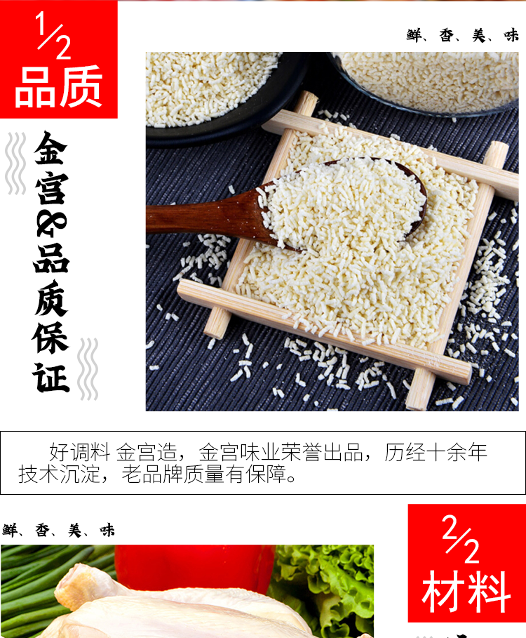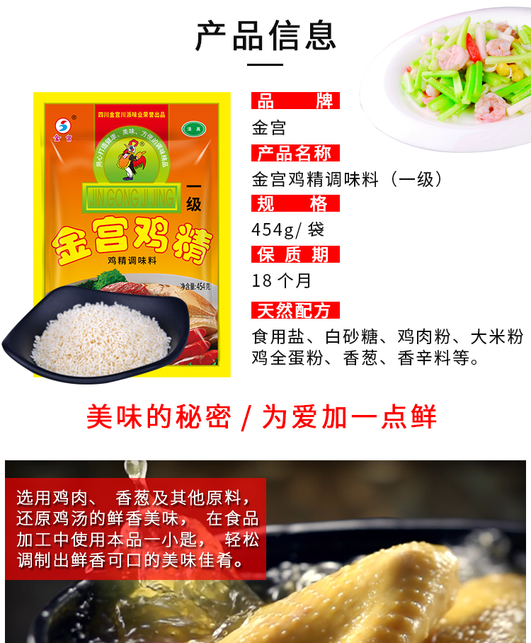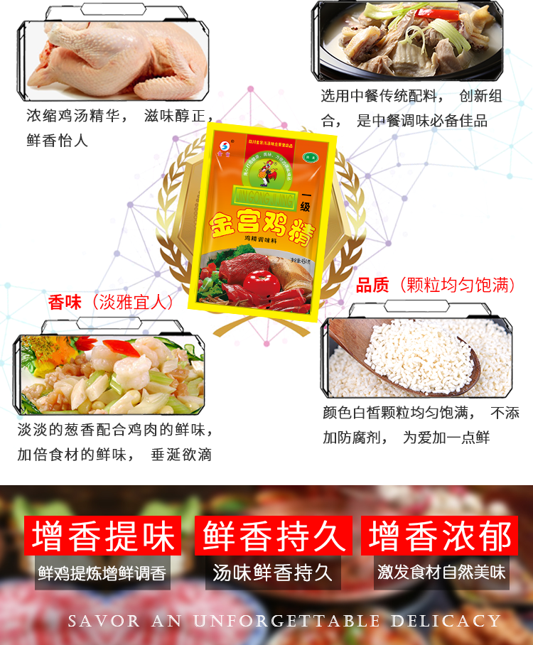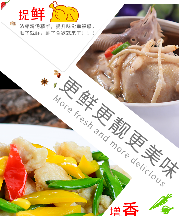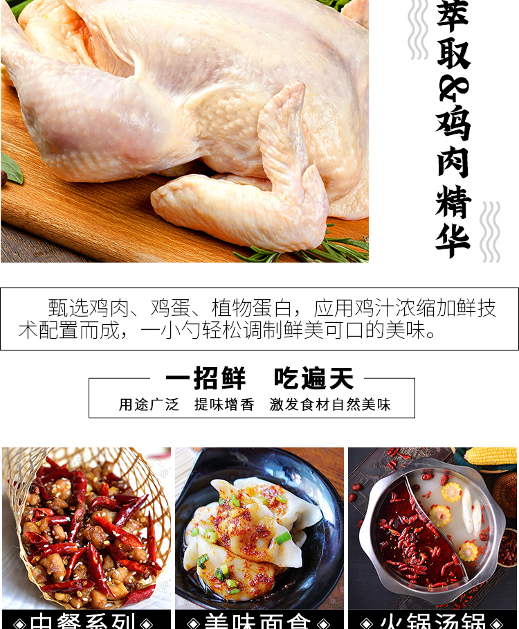 產品簡介:本品采用高科技和新工藝精致而成,具有上等雞湯的精華,味道鮮美、香氣濃郁,是家庭、酒樓、餐飲、火鍋、點心及食品加工的調味佳品。