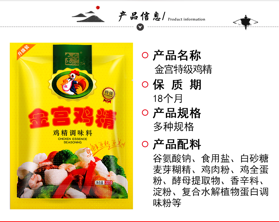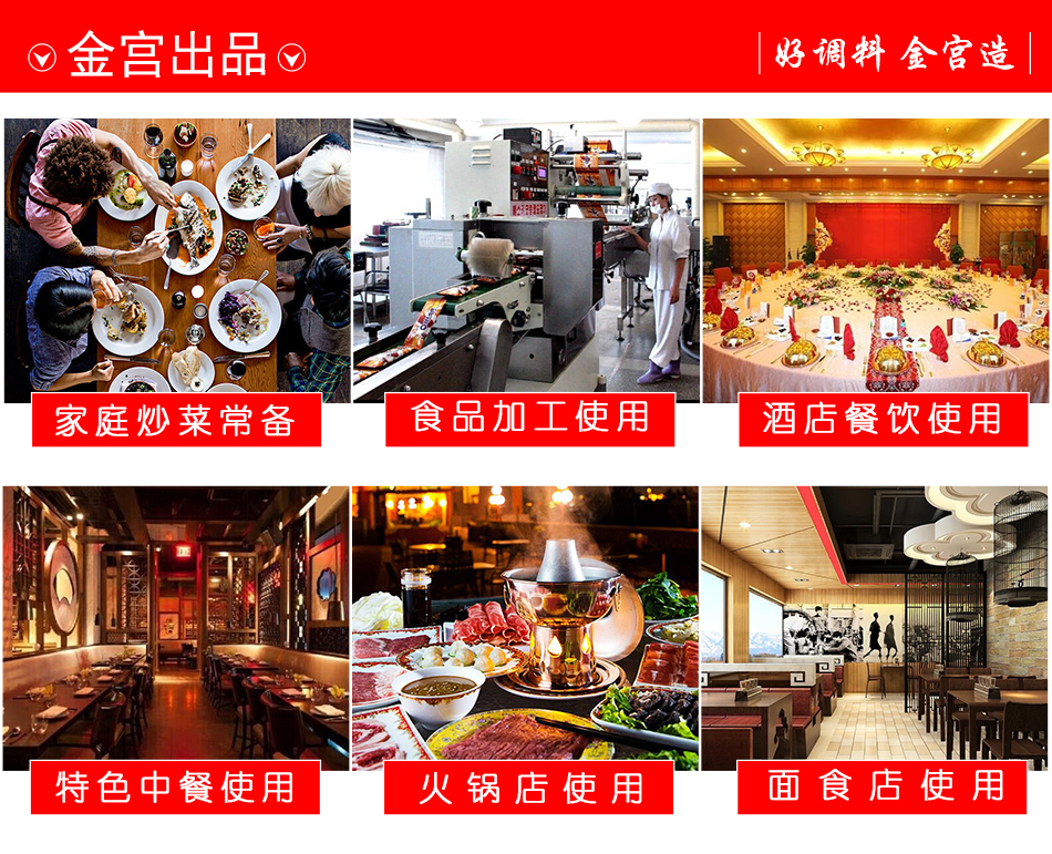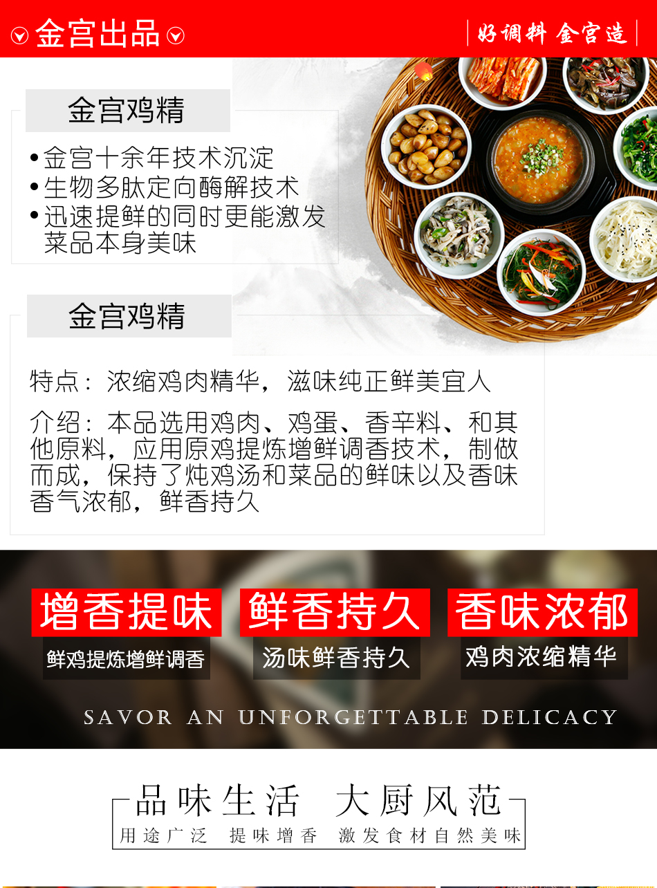 產品簡介:本品選用土雞、雞蛋及其他優質原料,經金宮資深調味師系統研究,應用高科技和先進工藝制成。本品味道鮮美、香氣濃郁、風味獨特,是家庭、酒樓、餐飲、火鍋、點心及食品加工的調味佳品。