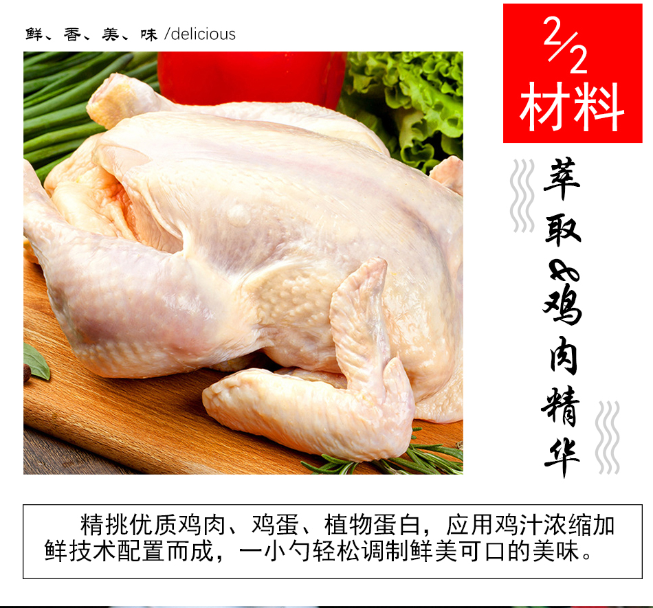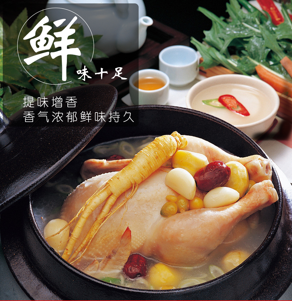 產品特點:濃縮雞湯精華,滋味純正,鮮美宜人。
