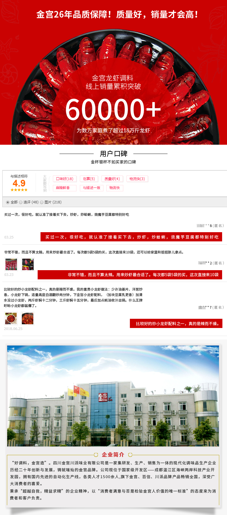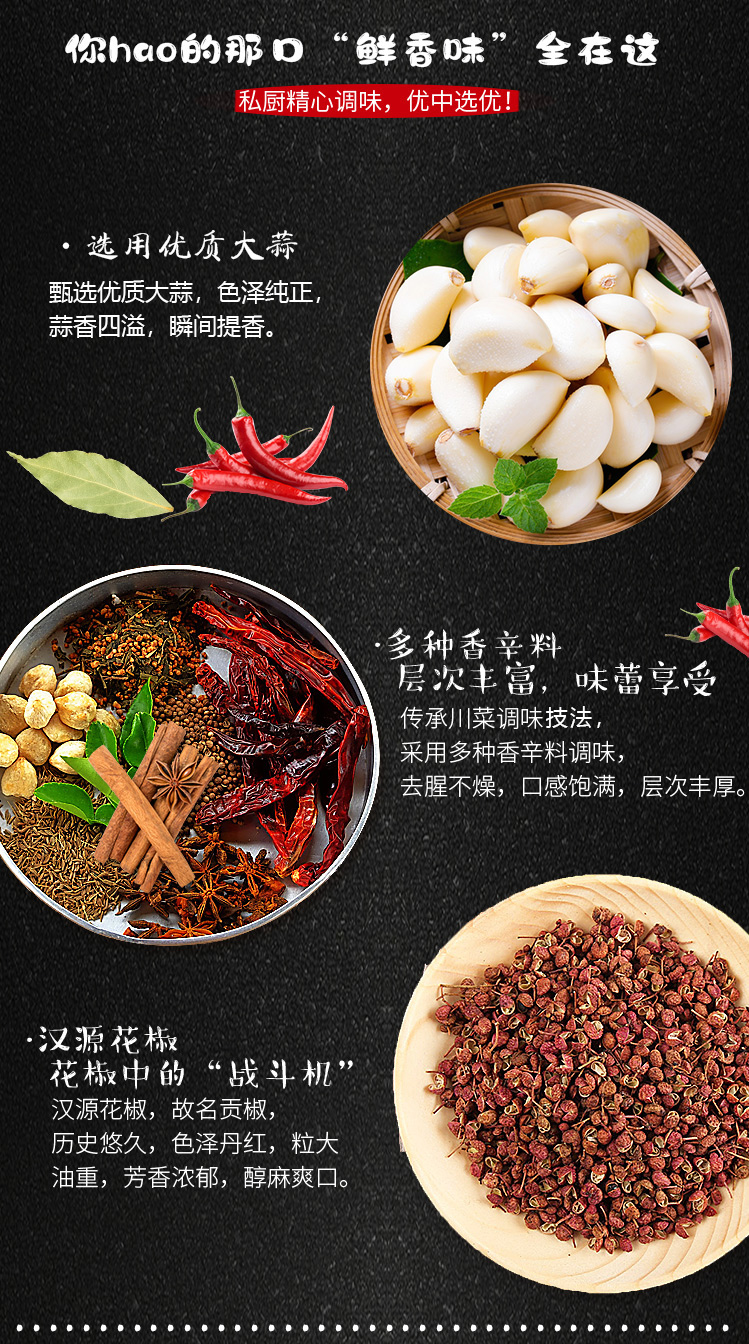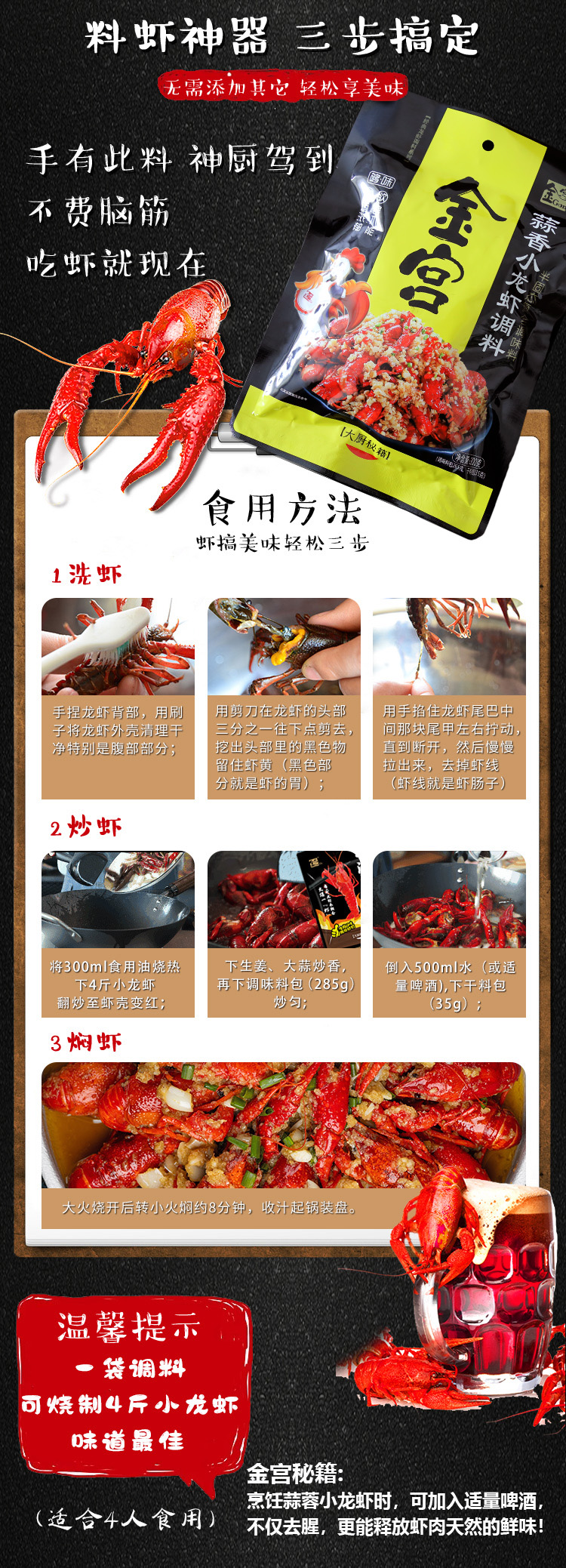產(chǎn)品簡介:本調(diào)料是金宮川派公司川菜研發(fā)團(tuán)隊收集川、渝江河上漁翁炒蝦的方法,精選新鮮大蒜、洋蔥、香辛料等煽炒爆香精心制作而成,烹調(diào)出來的小龍蝦外殼紅亮、蝦肉細(xì)嫩、蒜香濃郁,食之欲罷不能。