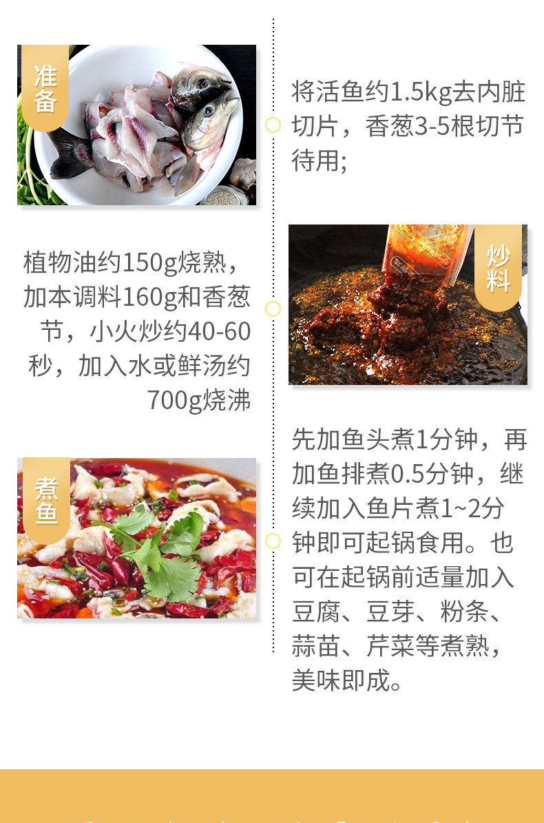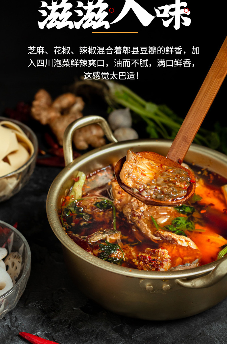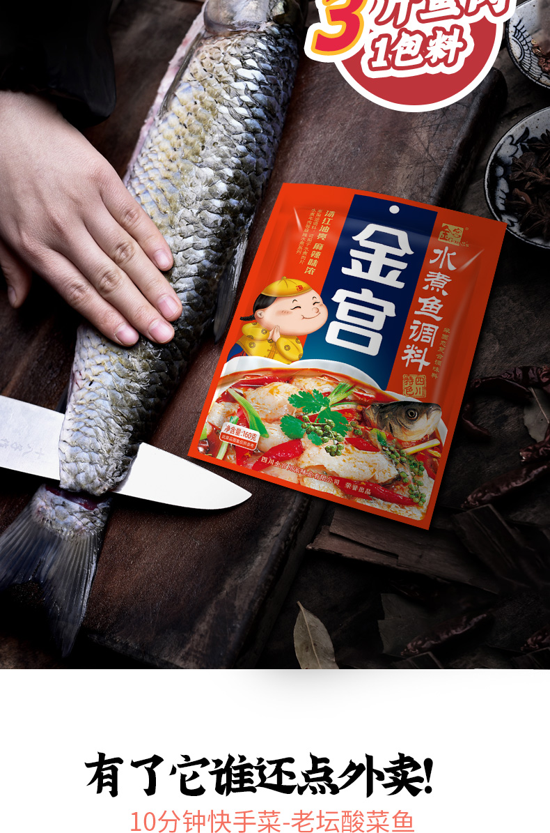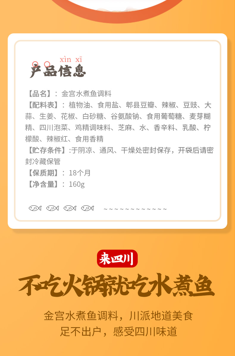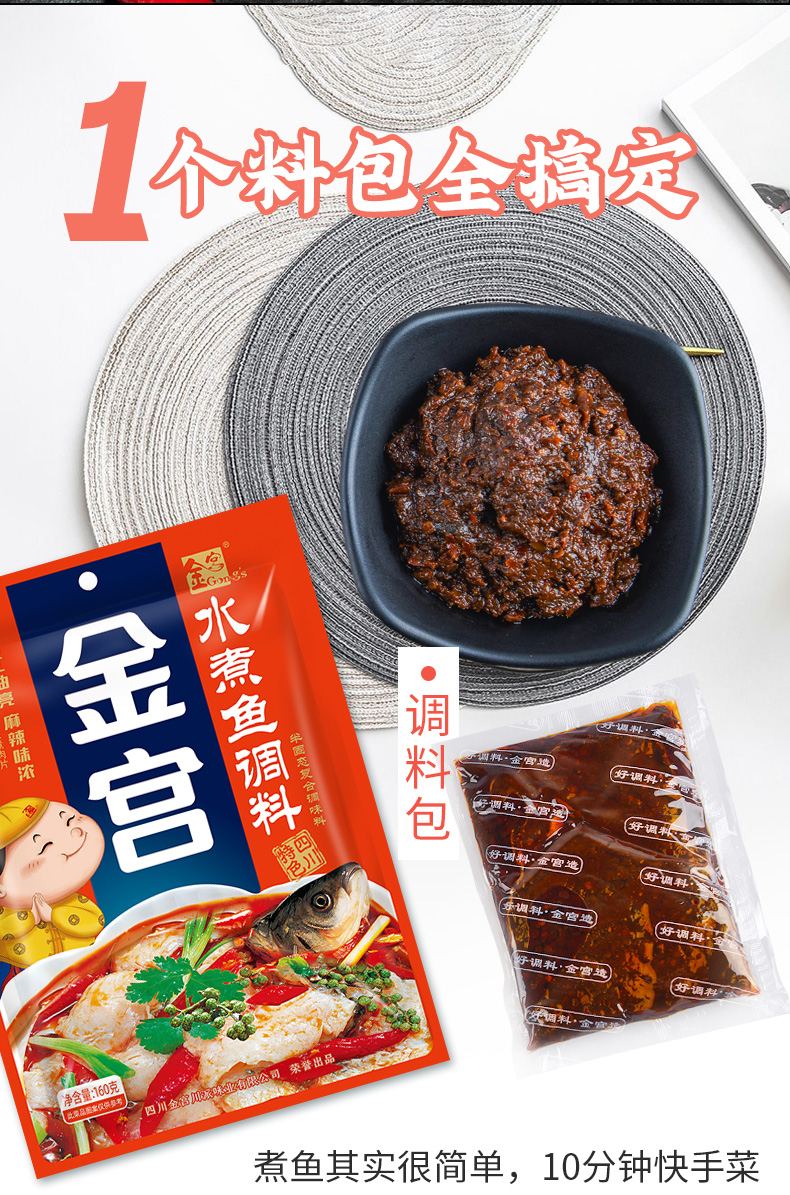 產(chǎn)品簡(jiǎn)介:金宮水煮魚(yú)調(diào)料不僅可烹飪特色水煮魚(yú),可用于水煮肉片、水煮牛肉等麻辣水煮系列,也可根據(jù)個(gè)人口味隨意添加辣椒、花椒,還可根據(jù)地方特色制作各種風(fēng)味獨(dú)特的水煮系列。