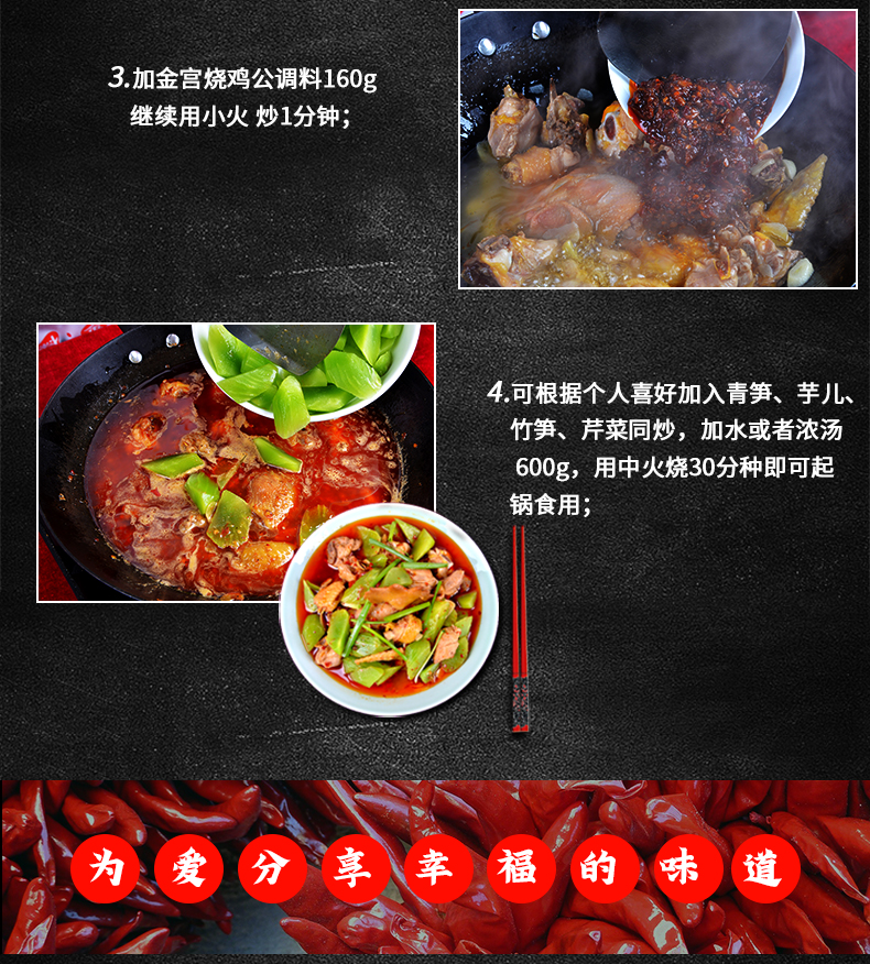 產品簡介:金宮燒雞公調料不僅可烹飪特色燒雞公,加青椒可制作青椒辣子雞,加孜然可制作孜然大盤雞,還可根據個人口味或地方特色制作各種風味獨特的雞。